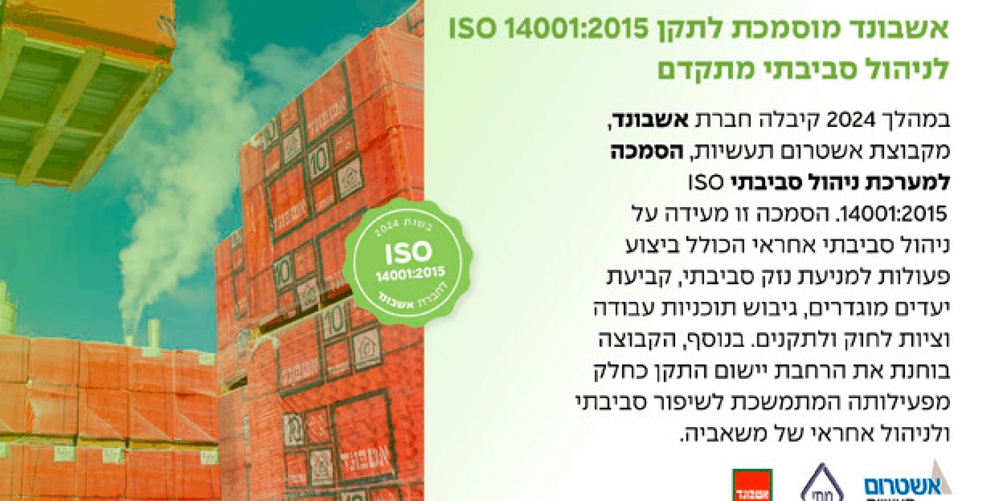 ההסמכה מעידה על מחויבותה של אשבונד ליישום תהליכי בקרה, מניעת נזק סביבתי, עמידה בתקינה ובחוק, וקביעת יעדים מדידים לשיפור מתמיד של הביצועים הסביבתיים.