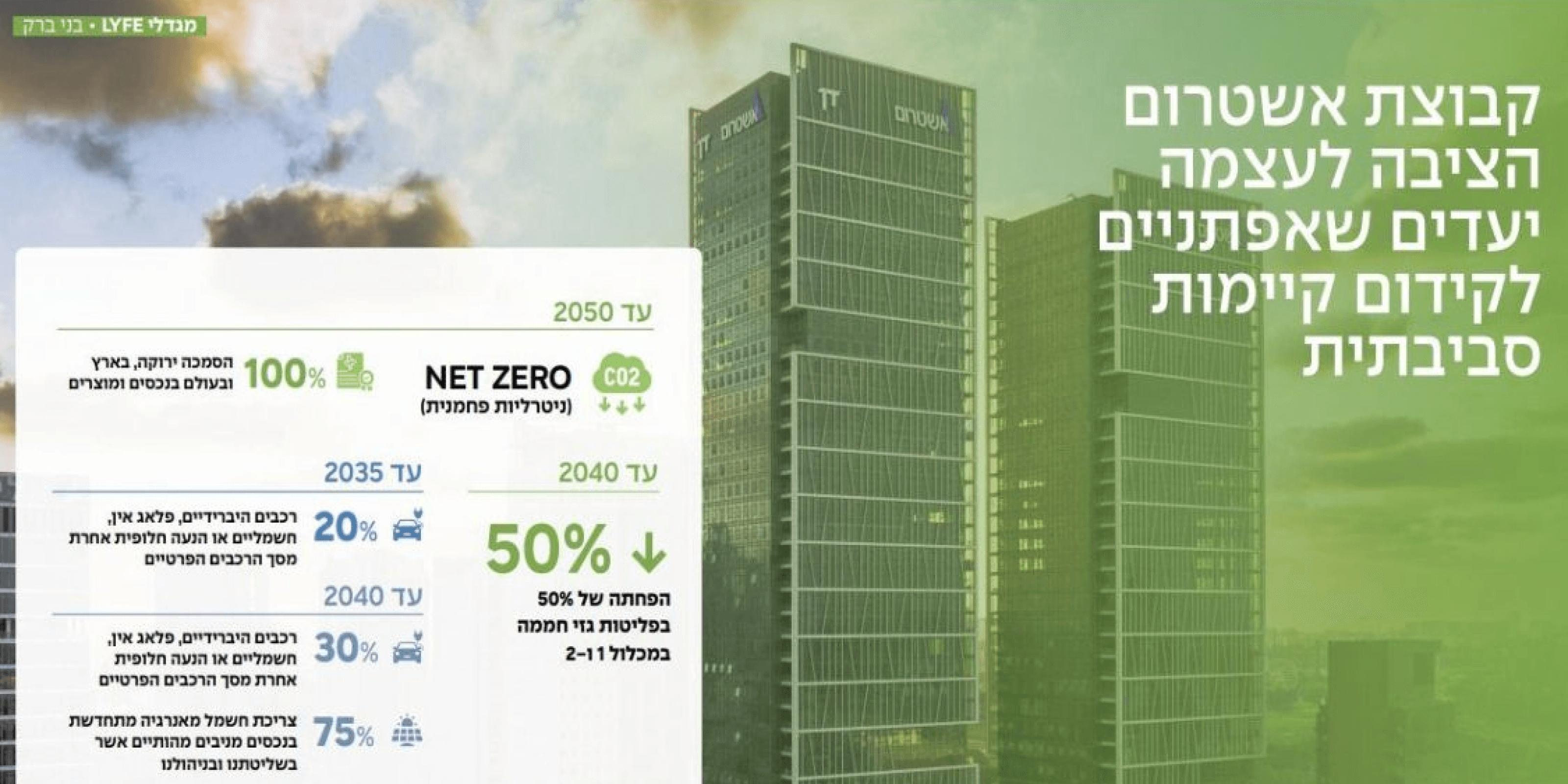 קבוצת אשטרום גאה לתכנן, ליזום ולבנות מתוך מחוייבות לספק פתרונות ברי קיימא לאתגרים הכלכליים, החברתיים והסביבתיים הניצבים בפנינו. אנו פועלים על מנת לקדם את פעילותנו בתחום ה-ESG מתוך אמונה כי כך נבטיח את המשך הצלחת הקבוצה ושגשוגה, לצד חיזוק העובדים, הקהילה והסביבה בה אנו פועלים.